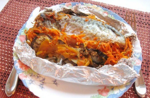 На овощи выкладывается подготовленная скумбрия, которую стоит сверху посыпать натертой морковью. Далее блюдо нужно завернуть в фольгу и поместить в заранее разогретую до 180 градусов духовку. Выпекать рыбу следует в течение 35-40 минут, но за 10 минут до готовности фольгу можно раскрыть, чтобы скумбрия слегка подрумянилась и приобрела золотистый оттенок.