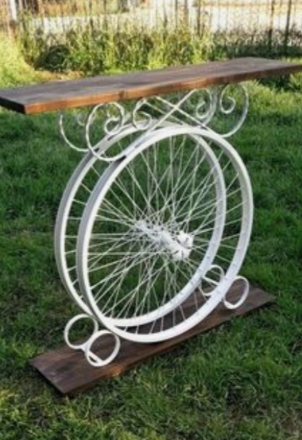 - Старые велосипеды: Используйте велоэлементы в качестве основы для необычного столика или подставки для растений. Крепите деревянные доски на колеса, окрасив их в приятный цвет.