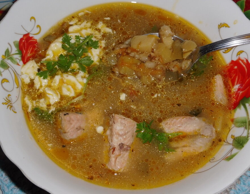 При подаче на стол в каждую тарелку кладут порцию разбранной рыбы, заливают супом и добавляют сметану или майонез по вкусу. Этот суп особенно хорош и на следующий день, когда он настоится.