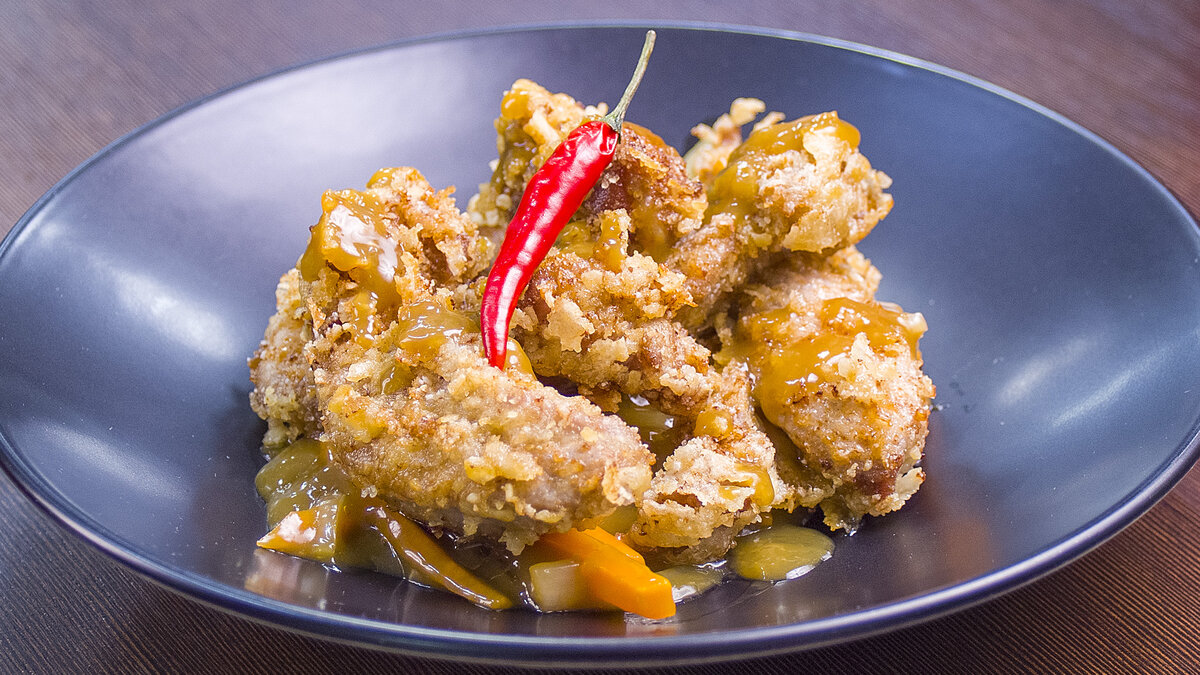 Как только мясо замариновалось, его обваливают в муке и жарят в кипящем растительном масле до появления золотистой корочки. Готовые кусочки выкладываются на бумажное полотенце, чтобы избавиться от лишнего масла.