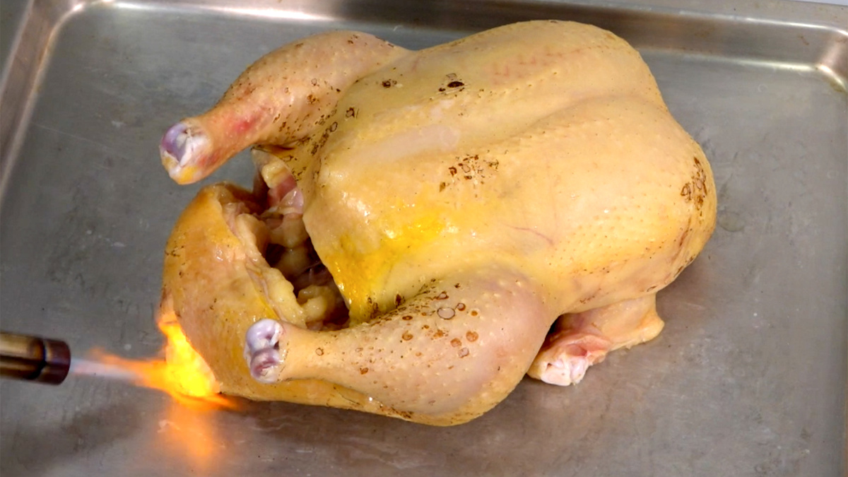 Перед запеканием курицу желательно обжечь на газу или с помощью специальной горелки. Это придаст мясу особую чистоту и превосходный аромат.