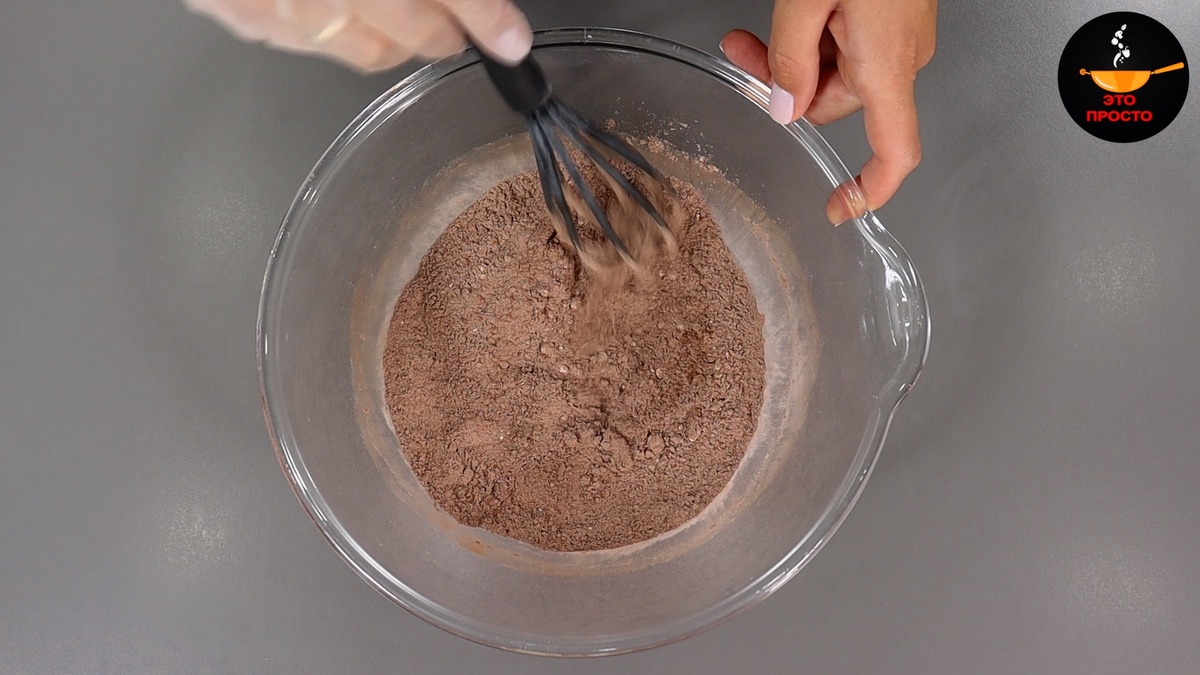 Сначала в глубокой миске соединяются 180 г сахарной пудры, 60 г какао, щепотка ванилина, щепотка соли и 10 г разрыхлителя. Все сухие ингредиенты тщательно перемешиваются до получения однородной массы.