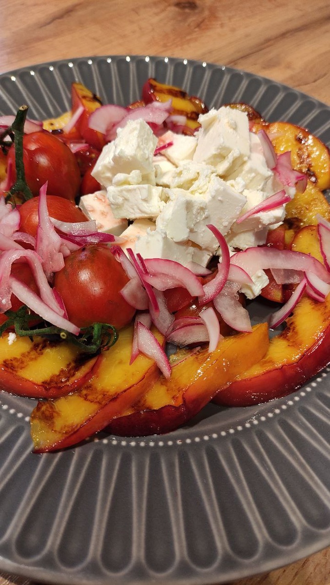 Представьте себе: сочные нектарины с легкой хрустящей корочкой, сладкий маринованный лук, тающий в рту сыр фета и теплые помидоры черри, щедро политые винно-медовым сиропом. Это не просто блюдо из ресторана — это ваш новый фаворит для жарких летних дней!