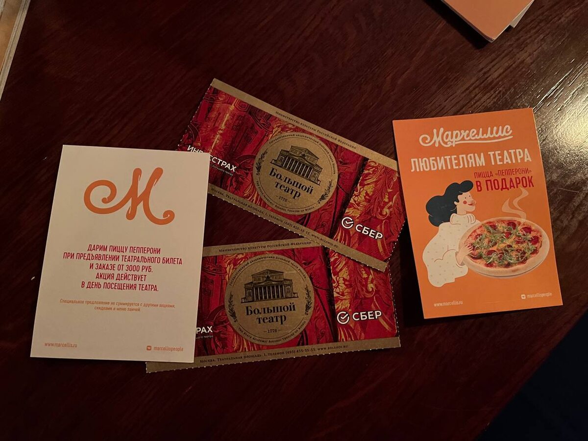 Решение было иллюстрировано несколькими факторами: вечерний час, близость ресторана к театру и специальное предложение на день спектакля. При предъявлении театрального билета и заказе от 3000 рублей, шеф-повар пообещал бесплатную пиццу пепперони.