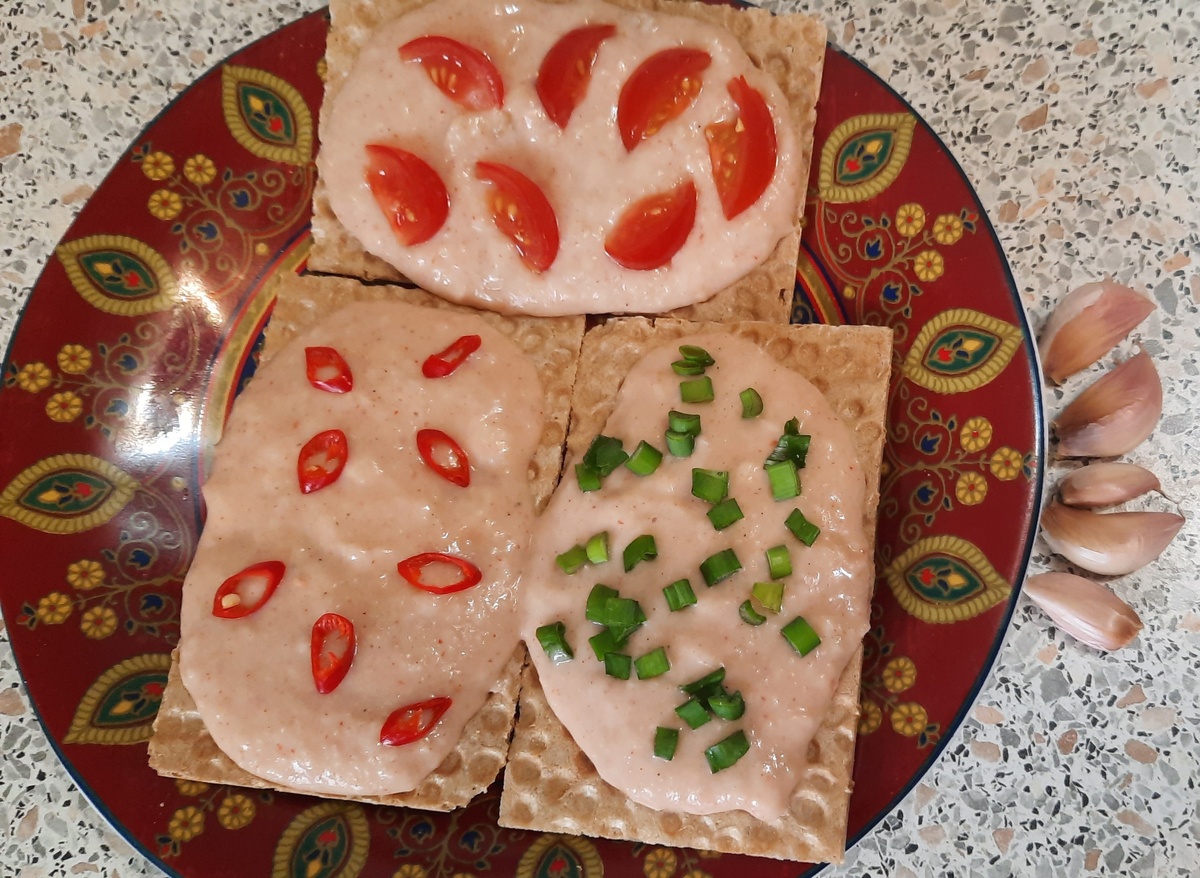 Когда консистенция вас устроит, выложите готовый паштет на хлебцы. Дополните блюдо нарезанным зелёным луком, яркими помидорами черри и кольцами острого перца для яркости.
