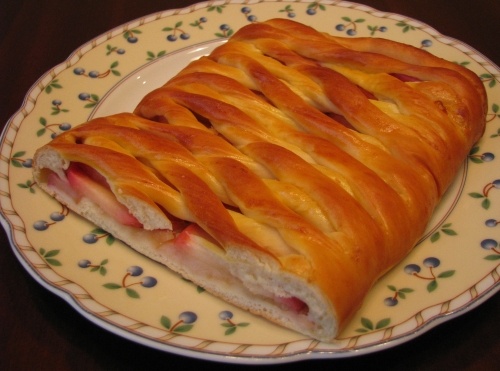 Теперь каждую заготовку следует раскатать в тонкий овал, посыпать тертыми сухарями или крахмалом, чтобы тесто не стало слишком влажным. Яблоки можно нарезать на дольки и выложить на тесто, посыпать сахаром и корицей. Важно сделать надрезы по краям теста, чтобы получились равные полоски для последующего плетения.