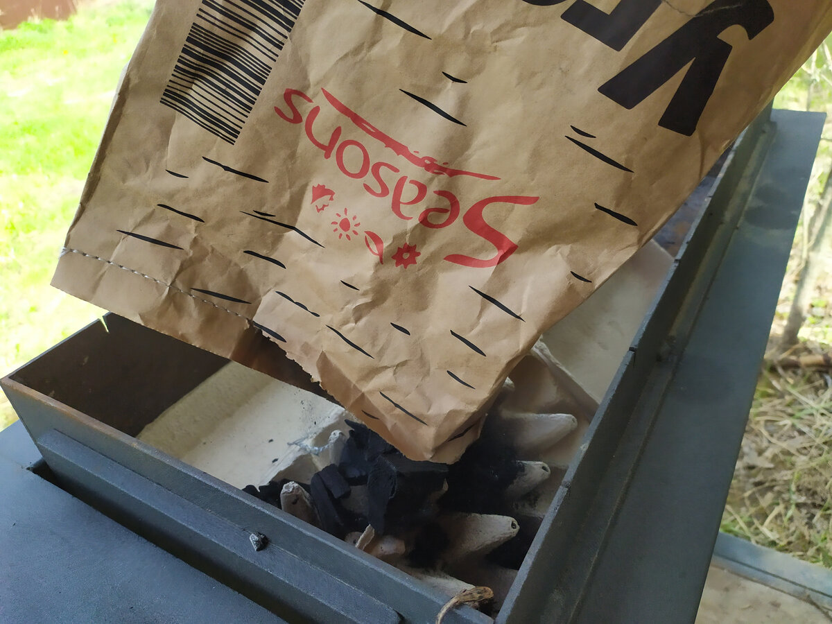 На этот раз команда совершила небольшой эксперимент: вместо предварительного маринования мясо было сразу подготовлено к жарке. Угли готовили с умом: добавив подложки из-под яиц, угли разгорелись быстрее и легче. Это стало настоящей находкой — никакого лишнего мусора, только ароматный жар.