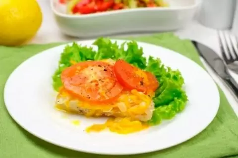 На рыбу выкладываются обжаренные овощи и несколько ложек свежих помидоров. Все это аккуратно заворачивается в фольгу, укладывается на противень и помещается в заранее разогретую духовку при температуре 180 градусов на 25 минут.
