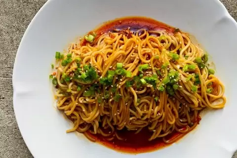 Измельчите чеснок и нарежьте зеленый лук мелкими кусочками.В небольшой миске смешайте чеснок с несколькими столовыми ложками воды и оставьте на несколько минут. Затем добавьте кунжутную пасту и тщательно перемешайте. При необходимости, добавьте еще немного воды, если паста слишком густая.Влейте в смесь чили масло, ароматизированный соевый соус, темный рисовый уксус и молотый сычуаньский перец. Все тщательно перемешайте, чтобы получить однородный соус.В отделенной кастрюле отварите лапшу до состояния аль-денте, затем обдайте холодной водой и переложите на тарелку. Если предпочитаете горячую лапшу, сразу же выкладывайте на блюдо. Полейте лапшу соусом и посыпьте сверху зеленым луком и жареными семенами кунжута. Ароматная лапша готова к подаче!Приятного аппетита!