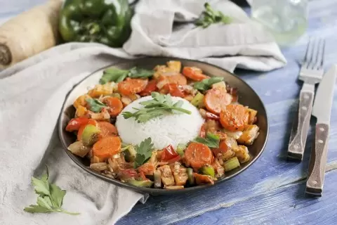 Шаг 3: Разогрейте сковороду с 1 столовой ложкой растительного масла. Обжарьте лук, чеснок, перец, пастернак, сельдерей и морковь на среднем огне в течение 5-7 минут. Приправьте солью и перцем, затем добавьте томаты, тмин, паприку и орегано. Тушите овощи еще 5-7 минут до мягкости. Подавайте готовое рагу на совокупности с рисом.