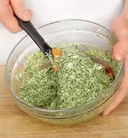 Для начала необходимо разогреть духовой шкаф до 160°C. Яйца разделить на белки и желтки: белки взбить до легкой устойчивости, а желтки соединить с мукой, щепоткой соли, нарезанным шпинатом и петрушкой. Взбить эту смесь до получения однородной массы и аккуратно ввести в неё взбитые белки.