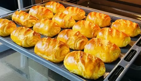 Теперь осталось лишь добавить начинку, аккуратно завернуть в рулет и уложить на противень. Для красивого золотистого цвета перед выпеканием смажьте изделия желтком и сделайте по три надреза на каждой булочке. Выпекайте в предварительно разогретой духовке при температуре 180 градусов около 25-30 минут.