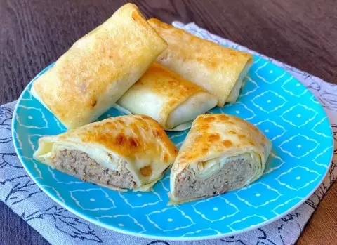 Смешайте все ингредиенты до получения однородной массы и обжарьте блины на сковороде. Выложите начинку на каждый блинчик и аккуратно сверните их в конвертики. Несмотря на то, что тесто без молока и сахара, блины приобретут аппетитный румяный вид после поджаривания на сливочном масле.