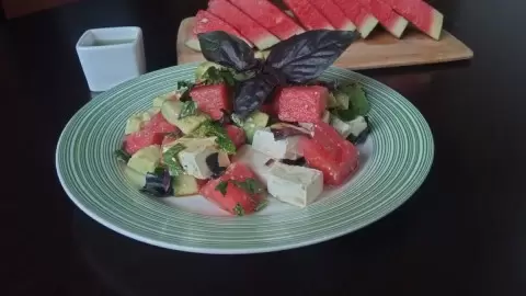 Этот салат — идеальный выбор для тех, кто предпочитает легкие и здоровые варианты ужина. Сочетая сладость арбуза с насыщенным вкусом брынзы, он также прекрасно подходит для начала дня. Добавление мякоти авокадо придает этому блюду новое дыхание.