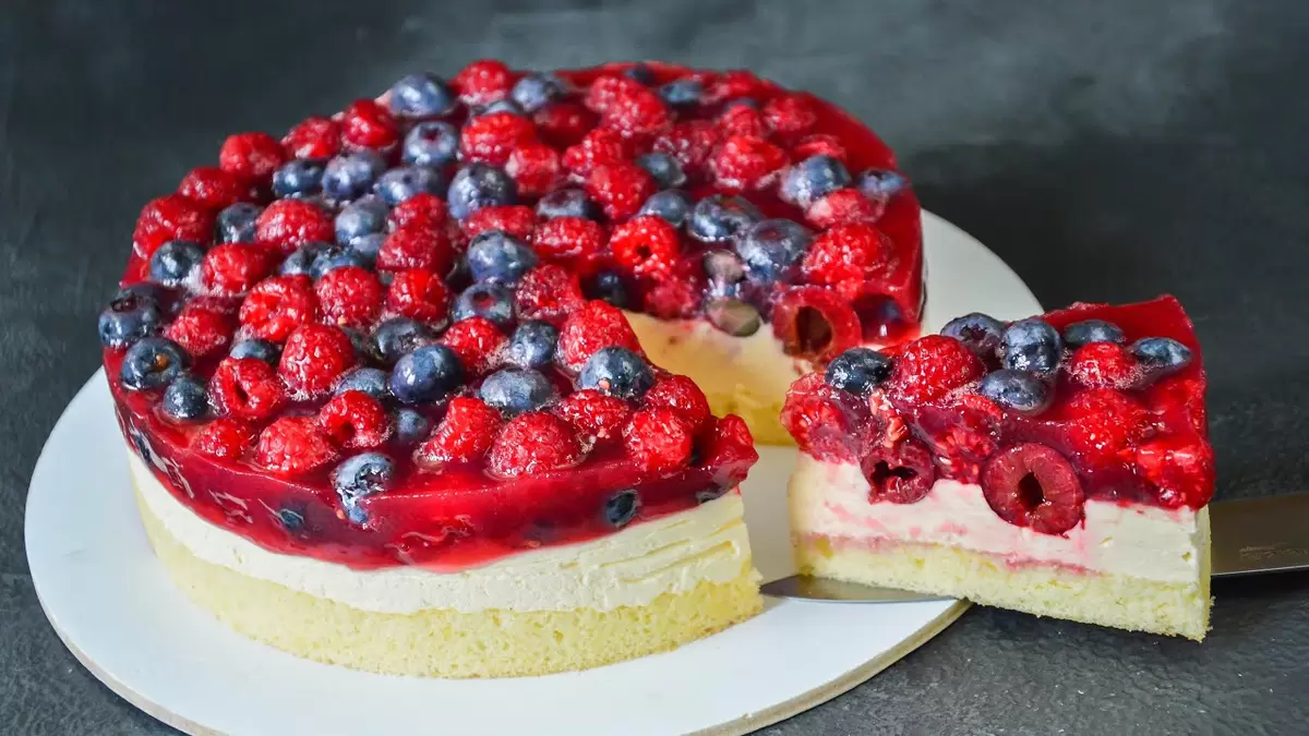 - 4. Ягодный слой: Замочить желатин в холодной воде. Ягоды нагреть с сахаром до выделения сока, затем убрать с огня и добавить желатин. Оставить до теплого состояния и аккуратно распределить по крему.