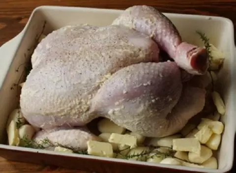 Тем временем курицу нужно тщательно посолить и поперчить по всем сторонам, включая внутреннюю часть, если используется тушка целиком. Внутрь также положить веточки тимьяна.