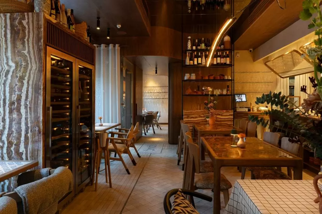 Интерьер Gris поражает своей атмосферой: два уютных светлых зала в гармоничном сочетании с изразцовой синей печью на открытой кухне создают ощущение летнего отдыха в солнечной Греции. Для дизайнерского решения студия Марии Федоровой Up To You Design, отвечавшая за оформление и других ресторанов «Комитета», выбрала множество элементов — деревянная мебель, зеркала и цветы, спрятанные в столах, дополняют картину.