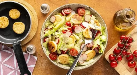3. Листья салата порвать на кусочки, редис нарезать кольцами, а помидоры – на половинки. В небольшой миске смешать оливковое масло, лимонный сок, соль и перец. В большом салатнике соединить салат, овощи и мини-сырнички, заправить приготовленным соусом. Готово! Ваше кулинарное творение готово к подаче.