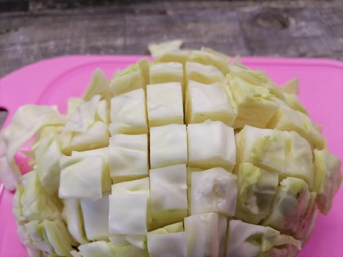 Начните с нарезки капусты: квадратными кусочками размером 1,5-2 см. Если есть предпочтение, её также можно нашинковать соломкой. Затем натрите морковь на терке.