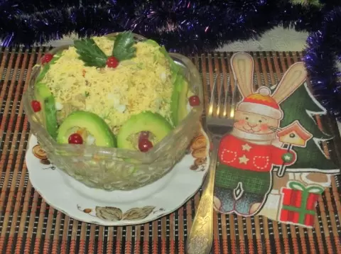 При необходимости посолите и тщательно перемешайте. Теперь перенесите салат в красивую посуду — хрустальную, чтобы добавить немного ретро-атмосферы. Украсьте блюдо натертыми желтками, оставшимися кусочками авокадо, ягодами смородины и зеленью петрушки.