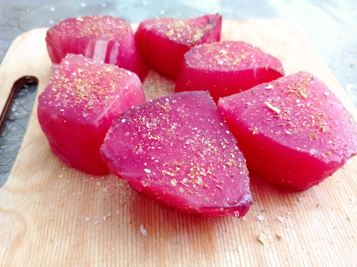 После обжарки тунец укладывается на овощное “дно”. Блюдо накрывается оставшимися тушеными овощами и тушится ещё 7-8 минут, чтобы вкус рыбы и овощей смогли друг друга обогатить.