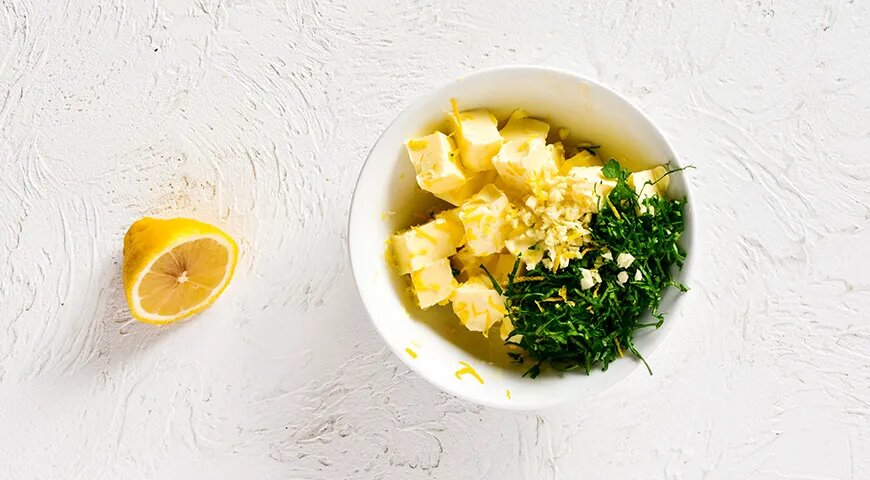 Начать следует с подготовки ароматного масла. Сливочное масло привести к комнатной температуре, а затем тщательно перемешать с натертым чесноком, мелко нарезанной петрушкой и добавленным лимонным соком. Не забудьте немного посолить и поперчить эту смесь. Оставьте масляную массу при комнатной температуре, чтобы она напиталась всеми ароматами.