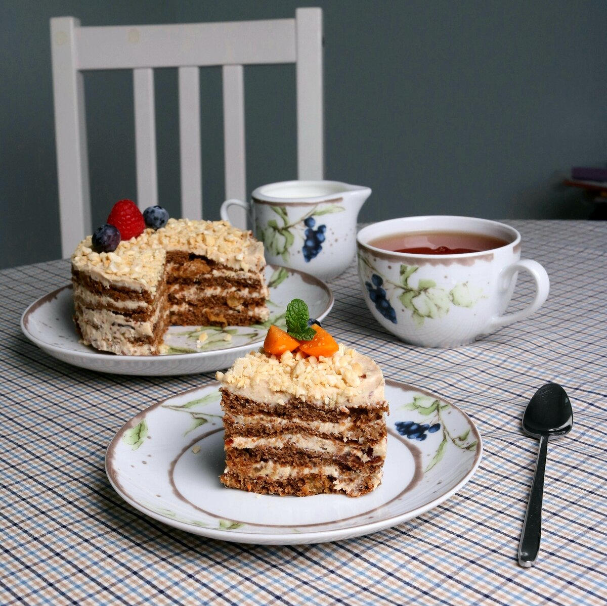 3. Для приготовления крема смешайте творог, йогурт и финики в блендере до кремовой консистенции. Промажьте коржи полученным кремом и поместите в холодильник минимум на 6-8 часов. Перед подачей посыпьте молотыми орехами.