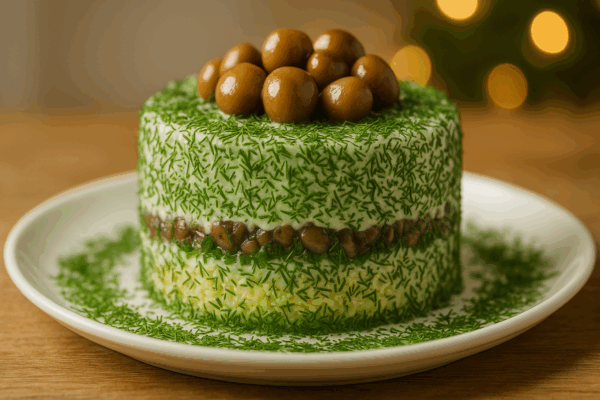 После завершения сборки салата кольцо аккуратно снимается, а верх украшен остальными опятами и посыпанным укропом. Этот красочный шедевр не только радует глаз, но и гарантирует восхищение гостей своим вкусом. Приятного аппетита!