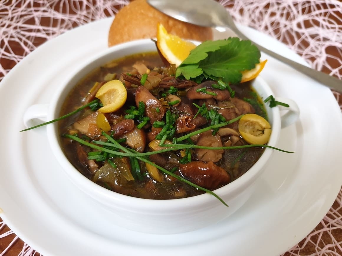 Сервировать солянку рекомендуется с долькой лимона и свежей зеленью, а по желанию — со сметаной. Эта ароматная грибная солянка станет настоящим украшением вашего стола и порадует близких своим насыщенным вкусом!