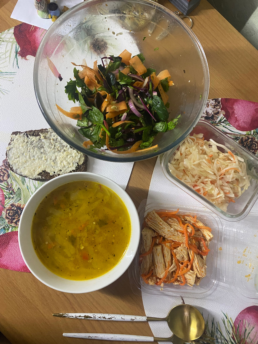 - Обед: Овощной салат, в который входят свежие ингредиенты и полезный пшено без соли и масла. В дополнение - морской коктейль, тушеный в сметане с добавлением лука, моркови и черного перца, создающий гармоничный и сбалансированный вкус.