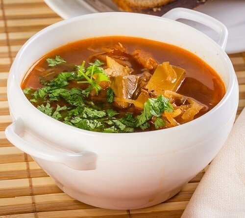 Когда грибы отварены, в кастрюлю с ним добавляются нарезанный картофель, который варится 10 минут, а затем отжатая капуста, продолжая варить еще 20 минут. В завершение в бульон добавляется тушеная овощная смесь, соль и перец по вкусу, и все вместе варится еще 10 минут. Готовое блюдо распределяется по тарелкам, где в каждое добавляется свежая зелень.