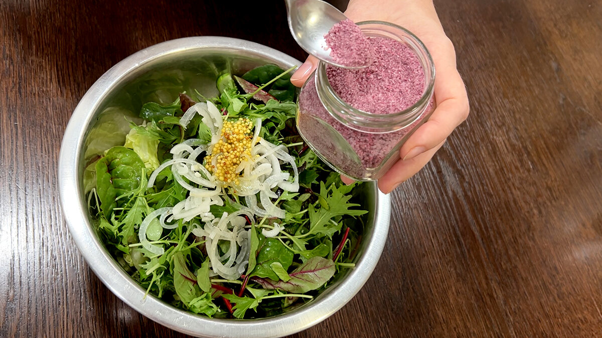 Для изготовления соли необходимо тщательно промыть листья фиолетового базилика и оставить на бумажном полотенце для подсушивания. В маленьком блендере смешивают кусочки лимона (вместе с цедрой, убрав только косточки), листья базилика и немного соли, постепенно добавляя ее для усиления аромата.