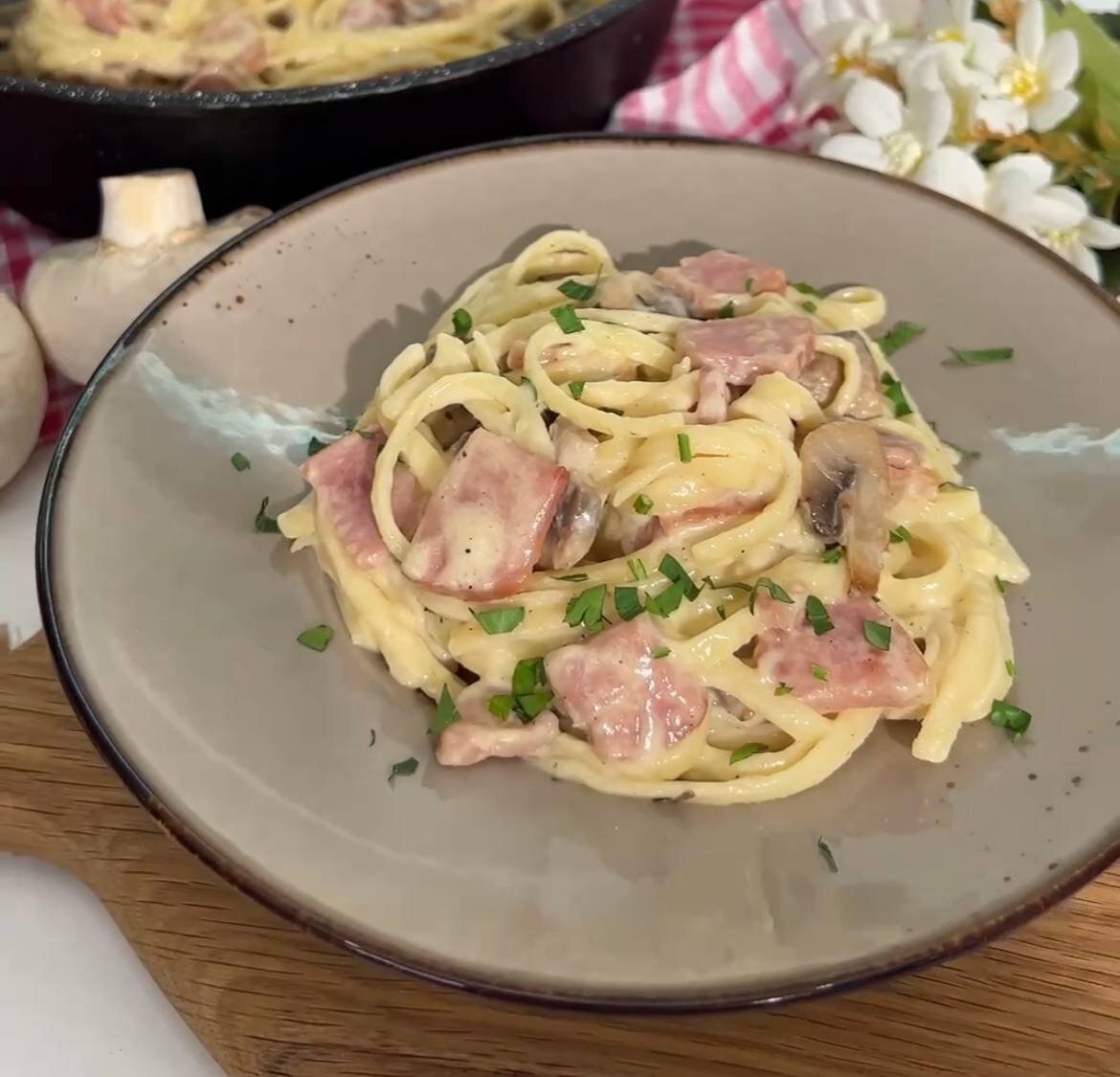 Теперь наступает самый интересный момент — приготовление соуса. Шампиньоны и ветчину нарезать, чтобы они были по-настоящему аппетитными. Затем обжарьте грибы на сковороде и спустя несколько минут добавьте ветчину. Залейте всё сливками, поперчите и дайте настояться на небольшом огне.