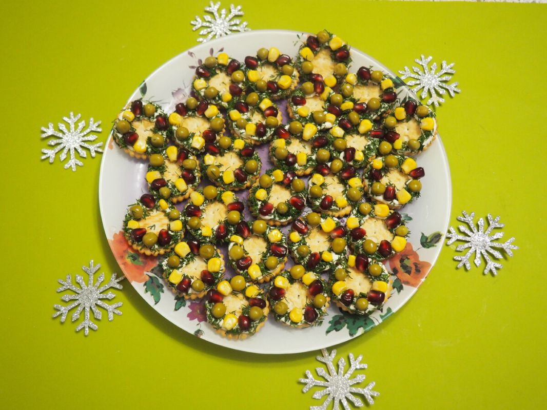 На завершающем этапе закуски декорируются горошком, кукурузой и гранатом. Эстетически оформленный «светофор» на укропном «поляне» добавляет яркости и праздничного настроения. Вкус у закусок сливочный с интересными фруктово-овощными нотами — идеальное сочетание для новогоднего стола.