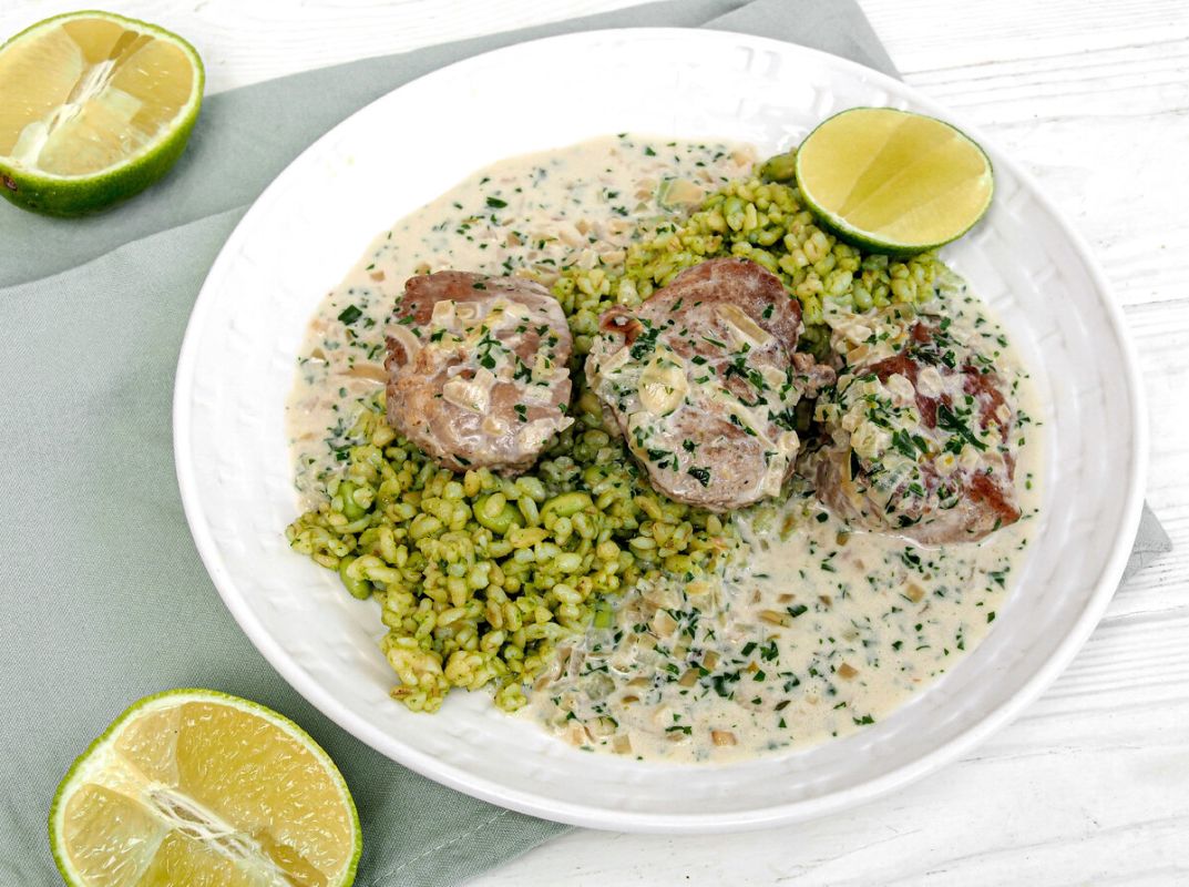 Подача: Разложите булгур с песто на тарелки, украсив медальонами из свинины и полив соусом.