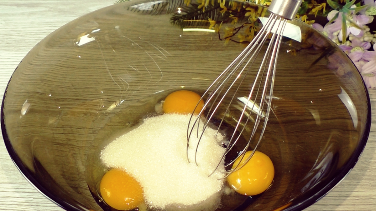 Для начала нужно взять глубокую миску и ввести в неё яйца, щепотку соли и сахар. Взбить все ингредиенты при помощи миксера или венчика до полного растворения сахара.