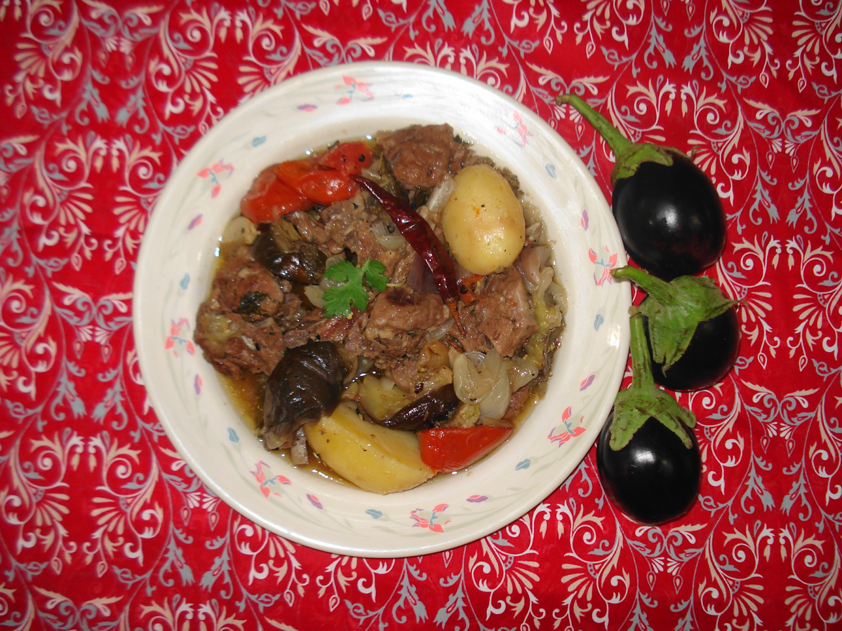 - Сначала на дно горшочка укладывают мясо, затем поочередно слои картофеля, баклажанов, помидоров и лука, каждый слой подсаливается и приправляется специями.