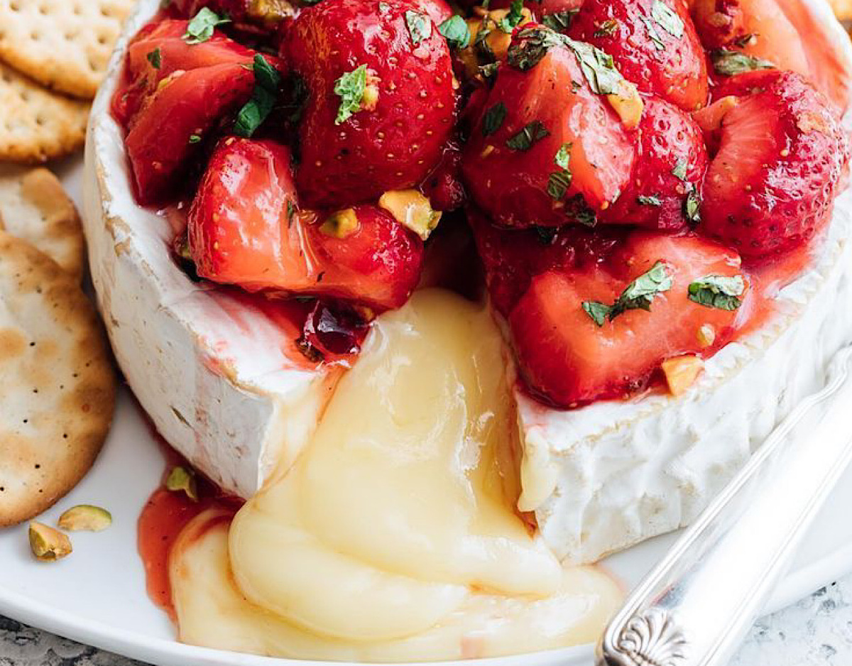 Подача: Выложите сыры, клубнику и орехи на доску, полив мёдом.