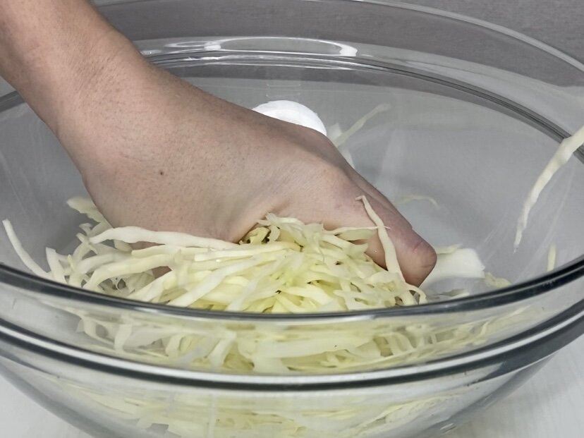 Приготовление этого салата не займет много времени. Начать следует с капусты: нарежьте её максимально тонко и слегка помните руками, чтобы она стала более мягкой. Затем очистите свёклу и натрите её на средней терке или для корейской моркови, добавьте в миску с капустой.