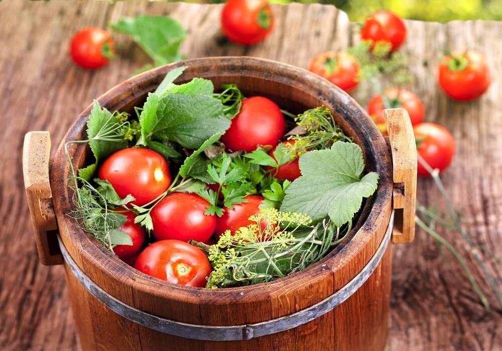 Необходимы также сладкий перец, который следует нарезать на кубики, и помидоры диаметром около 3-5 см, идеально подходящие для засолки. Перцы должны быть плотными и крупными, по возможности, около 200 граммов каждый, чтобы удачно вместить в себя помидоры. Все слои укладываются чередованием зелени и овощей, завершая процесс плотно накрывающими листьями хрена и установкой гнета.