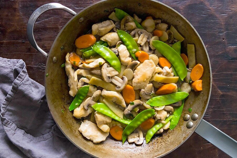 Курицу нарезать на небольшие кусочки толщиной около 5 мм, переложить в миску и добавить растительное масло, кукурузный крахмал и соль. Хорошо перемешать и оставить мариноваться на 10-15 минут.Зеленый лук нарезать, чеснок измельчить, а грибы и морковь — тонкими пластинками.В отдельной миске соединить все ингредиенты для соуса.Разогреть в глубокой сковороде столовую ложку растительного масла и обжарить кусочки курицы в один слой по 30 секунд с каждой стороны, пока они не подрумянятся и не станут слегка розовыми внутри. Переложить на тарелку.В ту же сковороду добавить еще одну столовую ложку масла, положить чеснок и зеленый лук, обжаривать до появления аромата около 20 секунд.Добавить морковь и грибы, готовить ещё 2-3 минуты, помешивая, пока они не станут мягкими.Добавить молодой горошек и обжаривать еще одну минуту.Перемешать приготовленный соус и влить в сковороду. Вернуть курицу, тщательно перемешать, пока соус не загустеет. Снять с огня и подавать немедленно.Приятного аппетита!