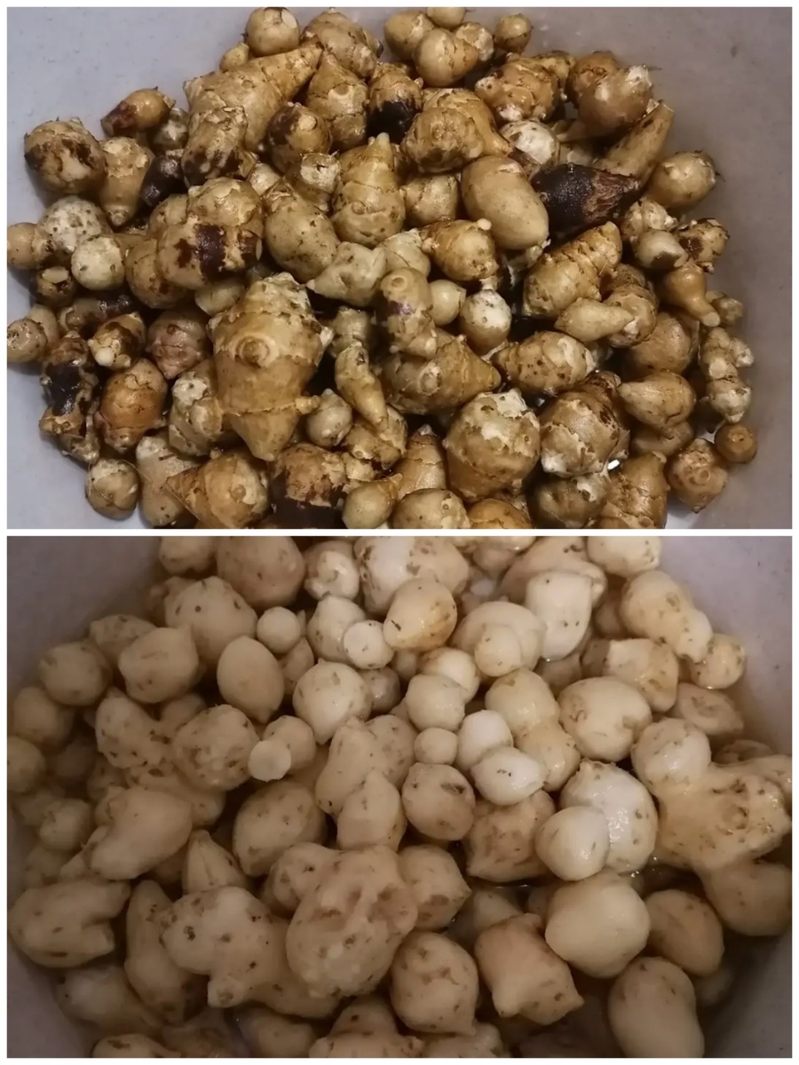 После подготовки корни нарезаются на дольки толщиной 0,3-0,5 см и укладываются на поддоны в электросушилке. Сушить рекомендуется при температуре 55°C на протяжении 10 часов. Полученные чипсы обладают сладковатым, слегка маслянистым вкусом, напоминающим орехи, хотя точно определить вид ореха может затруднить.