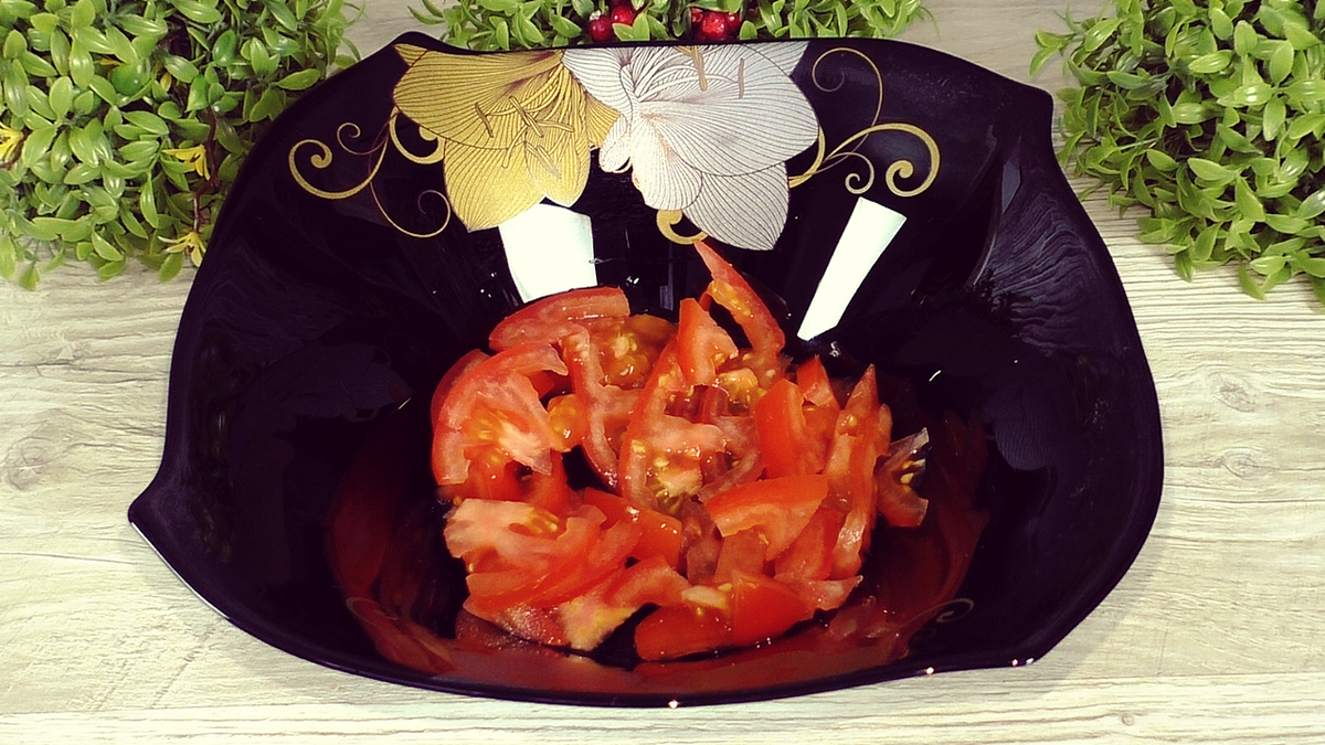1. Помидор необходимо тщательно промыть, нарезать небольшими кубиками и отправить в салатницу.