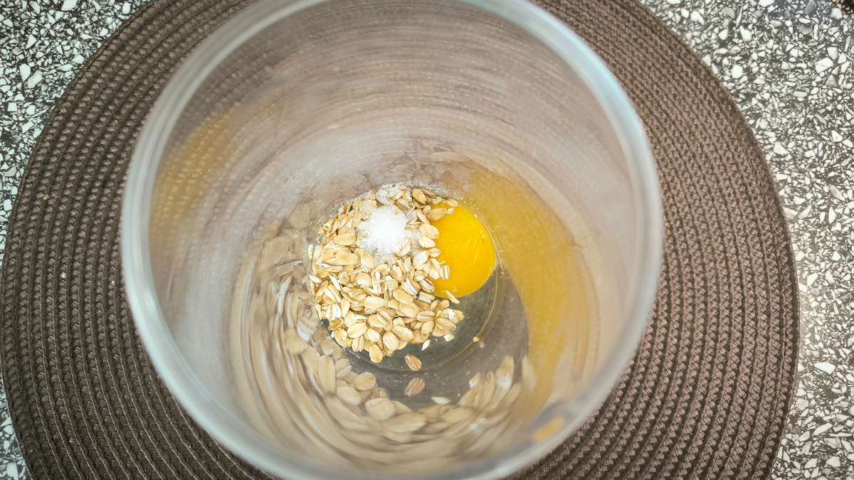 Сначала в глубоком стакане разбейте яйцо. К нему добавьте овсяные хлопья, соль и подсластитель. Все это необходимо взбить погружным блендером до получения однородной массы. Всего минута — и основа для блинчика готова!
