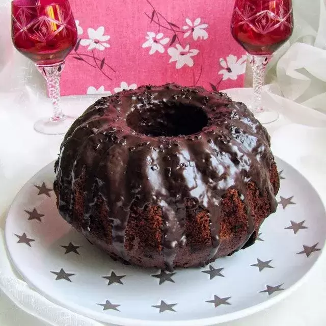 Для глазури нужно растопить 200 гр темного шоколада. Для приготовления: взбить яйца с сахаром, добавить растопленный маргарин, красное вино и коньяк. Смешать все сухие ингредиенты и соединить с жидкими компонентами. Выпекать при 180°C около 50 минут, покрыть глазурью после остывания.