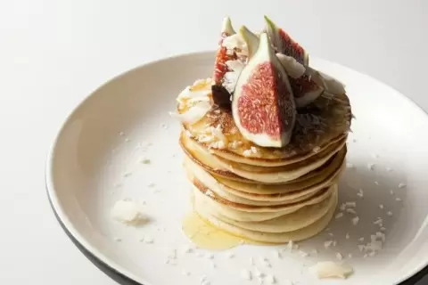 3. Подавайте горячие панкейки на тарелке, полив их сиропом, посыпав кокосовой стружкой и украсив дольками свежего инжира.