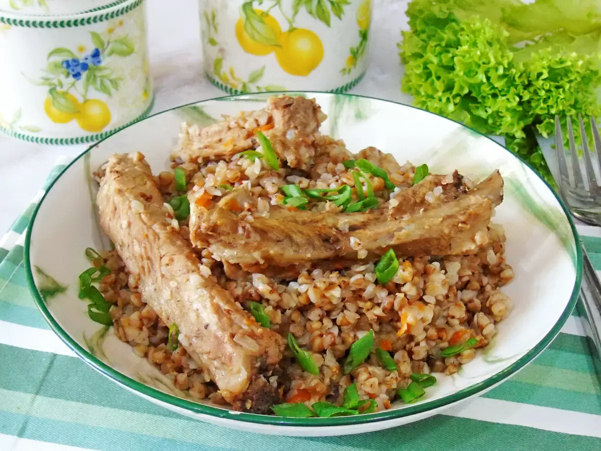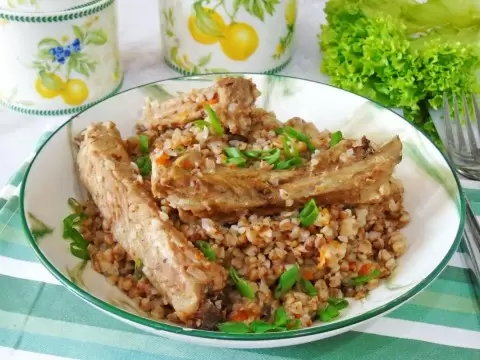 Ребра поначалу обжаривают, чтобы запечатать сок и сохранить сочность. Затем к мясу добавляют лук и морковь, прогревая их вместе, чтобы овощи отдали часть цвета и запаха жиром. В жидкость добавляют воду и лавровый лист, после чего всё томится под крышкой, пока мясо не станет мягким и легко отделяется от кости. В этот момент к сковороде присоединяется гречка: крупа промыта и распределена по основанию, она впитывает мясной сок и жир, превращаясь в рассыпчатую, но не сухую кашу.