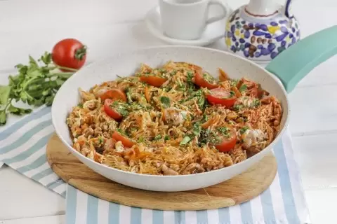 Вкусное и экономное блюдо: куриное филе с лапшой в томатном соусе