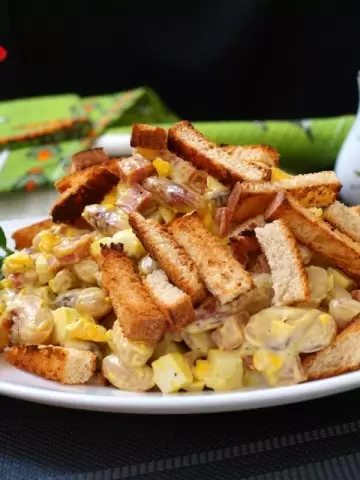 - Салат с кукурузой: С добавлением консервированной кукурузы и кусочков белого батона, этот вариант станет легким и изысканным.