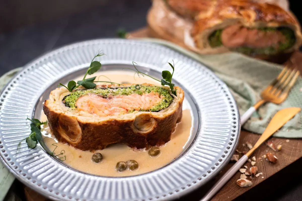 Этот восхитительный рецепт Веллингтона с лососем станет настоящим украшением любого стола. Слоеное тесто, золотистая корочка и нежное филе лосося — идеальное сочетание для гурманов. Давайте познакомимся с процессом его приготовления и удивим своих гостей.